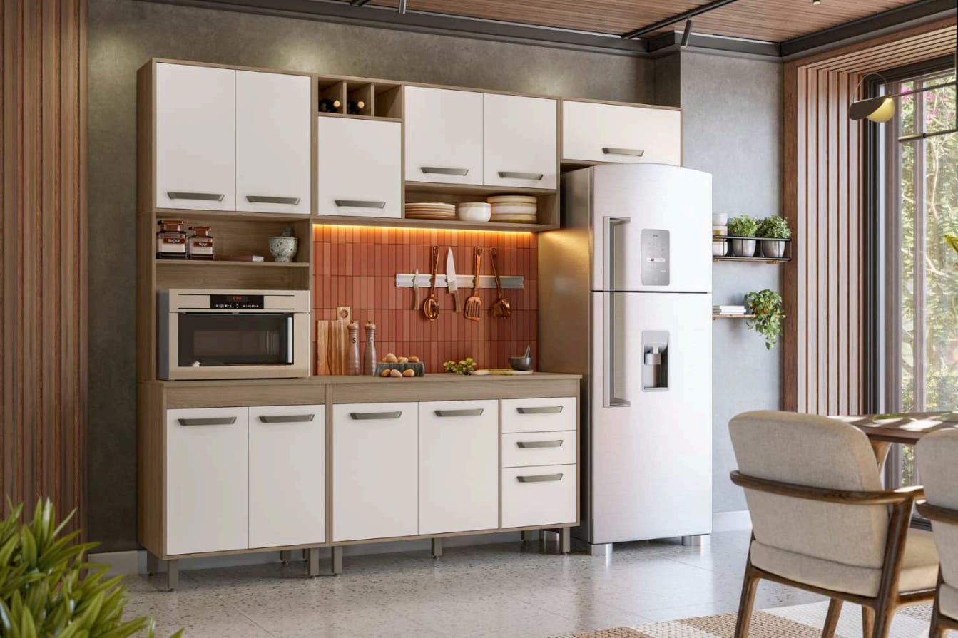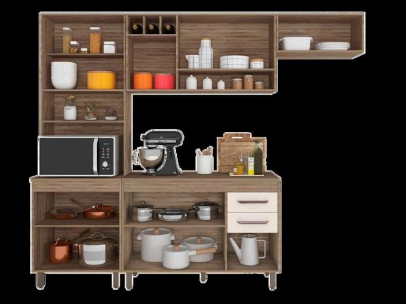 Cozinha Barcelona, em MDP, largura 218.0 cm, largura 258.0 cm, profundidade 50.0 cm Benefícios, produzido em mdp porta de bater e porta basculante, pé em PVC regulável, corrediças metálicas, puxadores em polimero, adega, poliman móveis