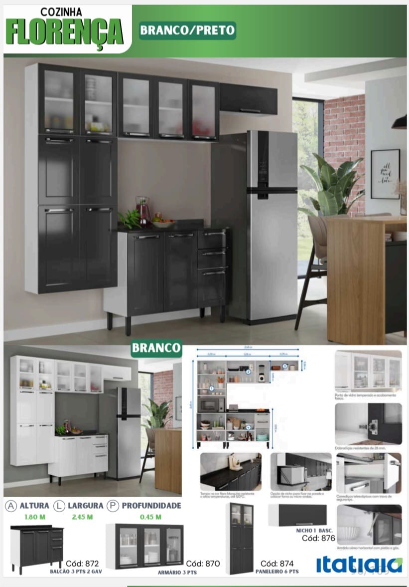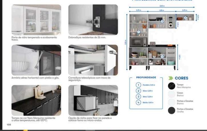 altura 1.80 cm / largura 2.45 cm / profundidade 0.45 mm balcão 3 portas 2 gavetas / armario 3 portas paneleiro 6 portas nicho 1 basc