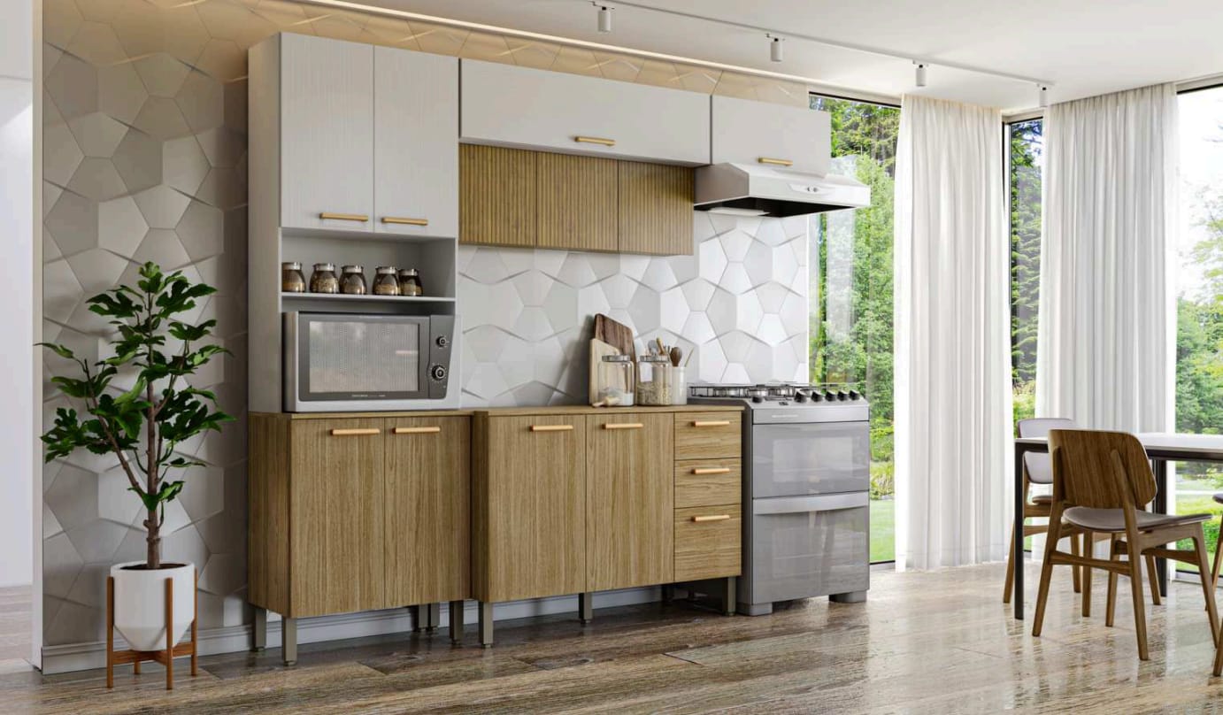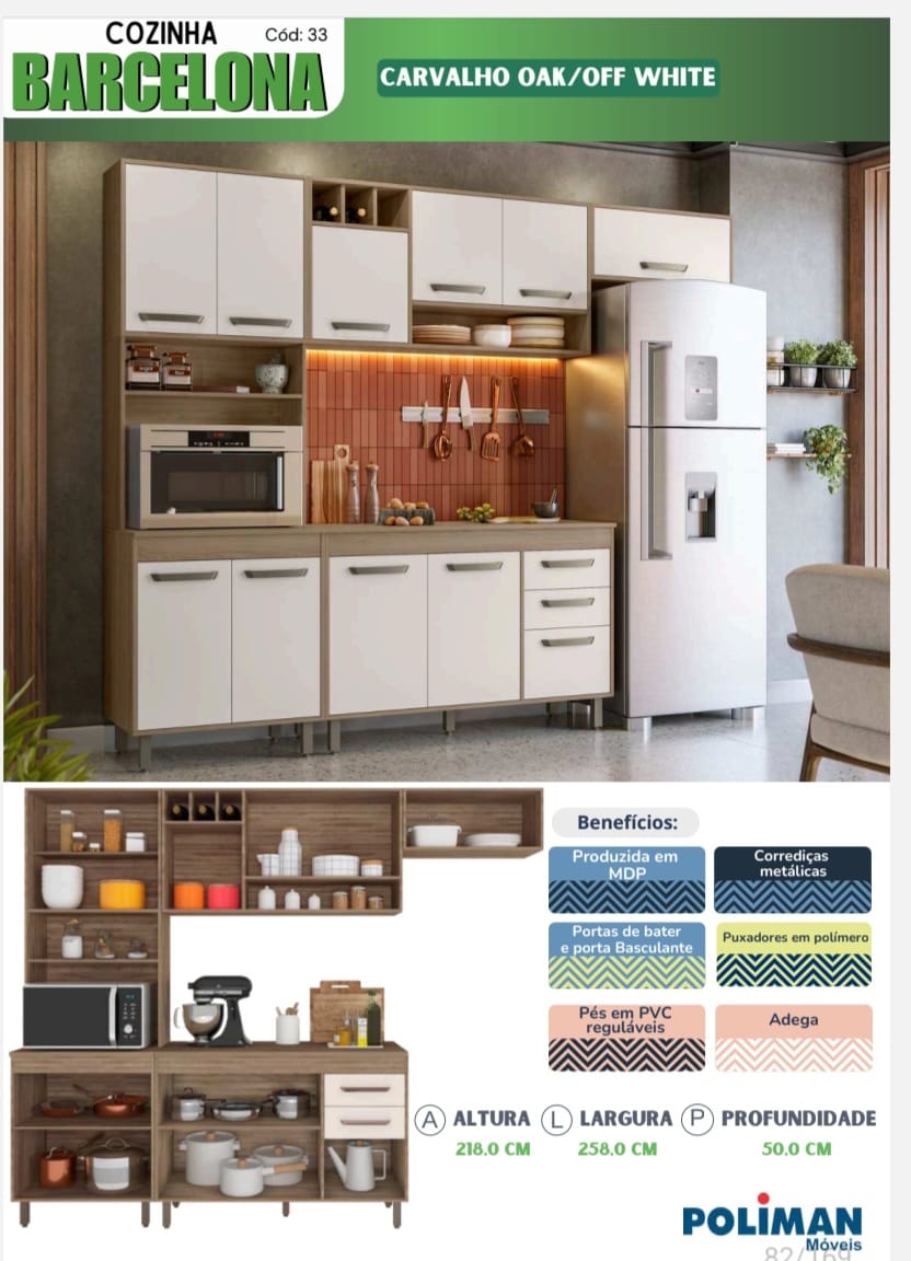 Altura 217.0 cm, largura 260.0 cm, profundidade 42.3 cm Benefícios, amplo espaço interno, portas em 15 mm, textura dot, pés reguláveis, dobradiças 100% metálicas nichos decorativos, pode ser usado pia inox, porta basculante com pistão a gás, material MDP, ( kits Paraná) Puxadores em ABS com pintura Gold, corrediças telescópicas, gavetas com amplo espaço interno