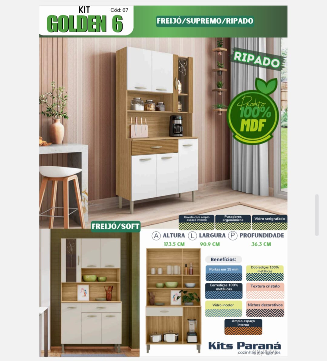 Kit Golden .6 em MDF, altura 173.5 cm, largura 90.9 cm, profundidade 36.3 cm Benefícios, gaveta com amplo espaço interno, puxadores ergonômicos vidro serigrafado, porta em 15 mm, corrediças 100% metálicas, vidro incolor dobradiça e 100% metálicas textura Cristalo, nichos decorativos, amplo espaço interno, kits Paraná