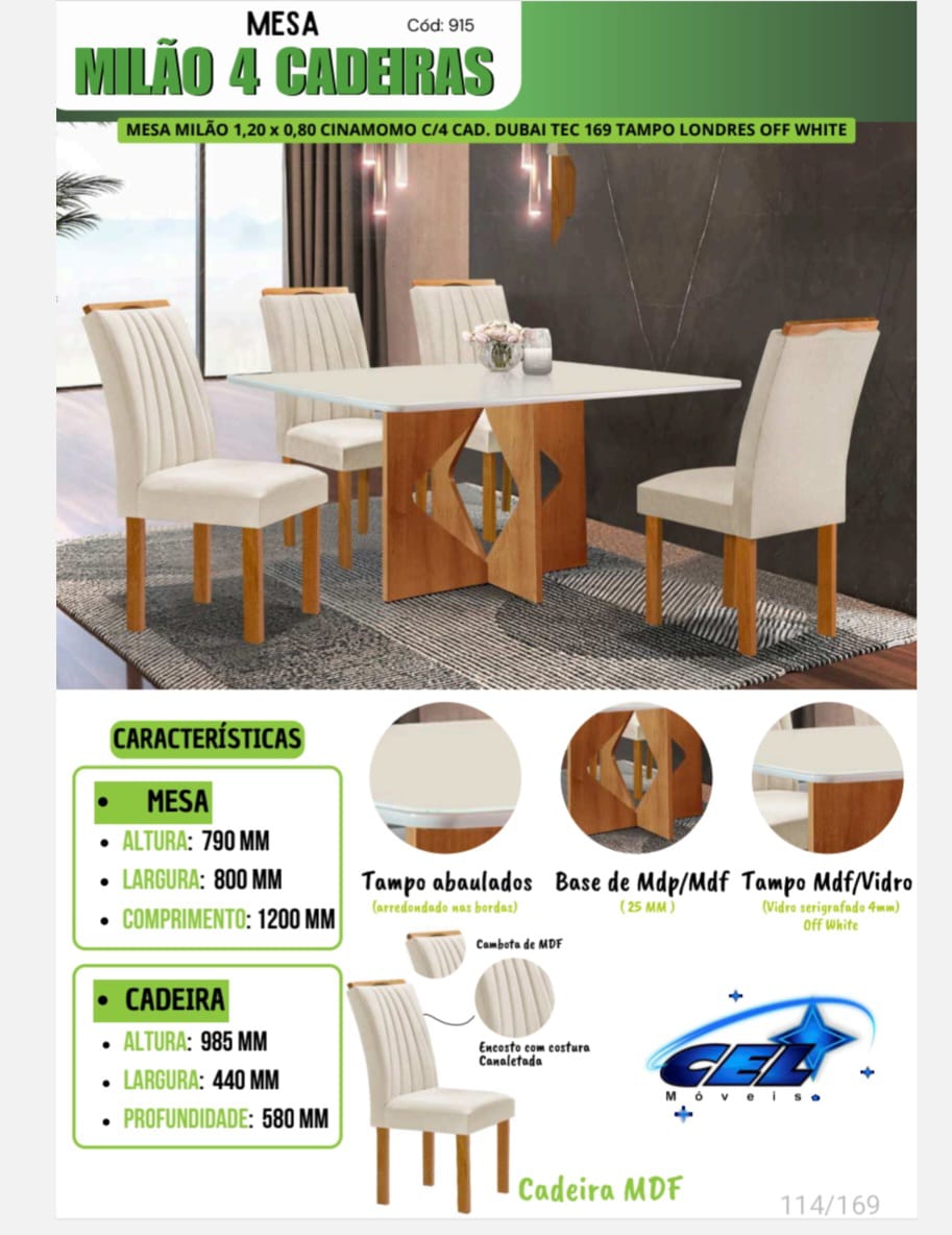 mesa milao 1,20 x 0,80 cinamomo c/4 cad. dubai tec tampo londres off white caracteristica, mesa, altura 790 mm, largura 800 mm, comprimento 1200 mm, cadeira, altura 985 mm, largura, 440 mm,profundidade 580 mm ,cadeira mdf cel moveis